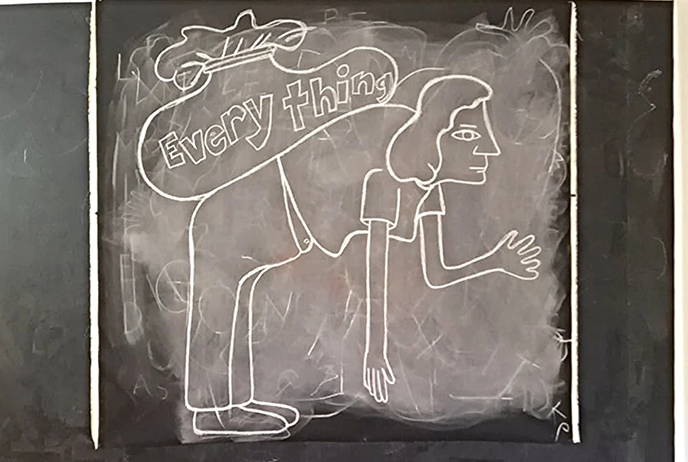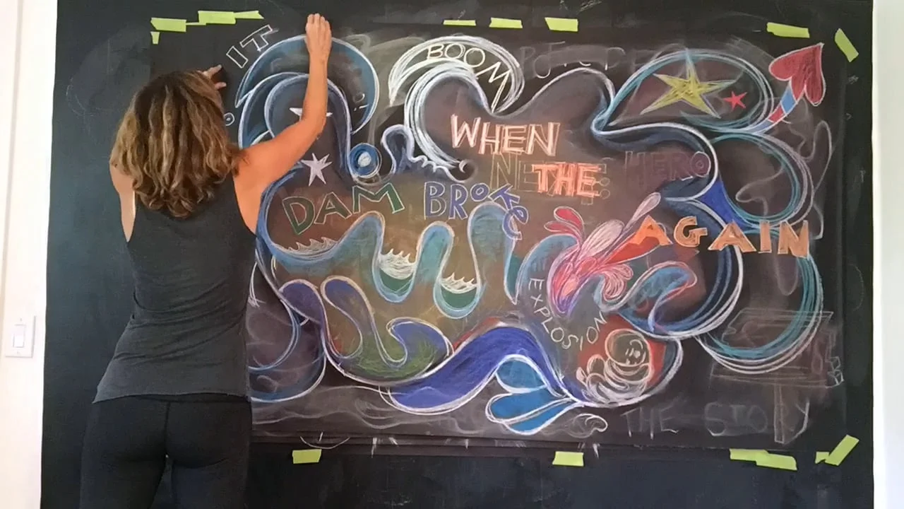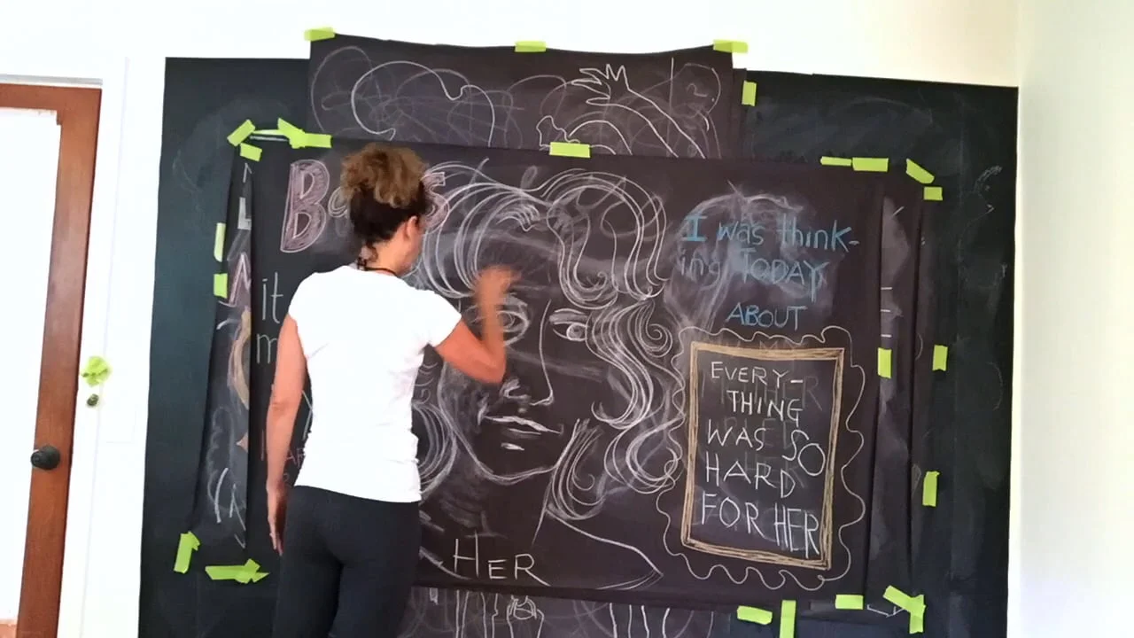 These drawings were created on an old barn wall, in 2015. Chalk on blackboard paint, eraser and water. Roughly 9' x 9'. Shot over many months in time-lapse, this documents a major shift in my life and an important new direction in my work.